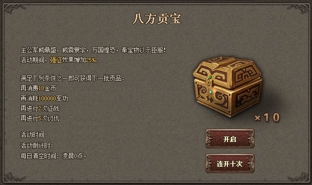每获得一批贡品,您都能开启一个贡品宝箱,不仅有可能得到银币、金币、军令、军功、威望、突飞令中的一种,还有机会获得额外2倍、4倍、10倍暴击奖励 。