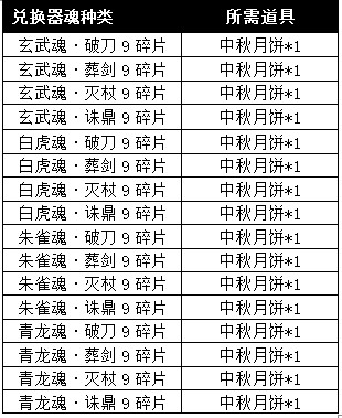4、中秋月饼可以在“兑换”处兑换各职业的第九个器魂碎片!