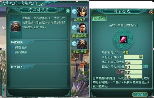 “试炼之门-符石补天匠”处可进行镶嵌和摘除,镶嵌和摘除的时候都需要收取一定的灵石,越高等级的符石,所需要的灵石越多